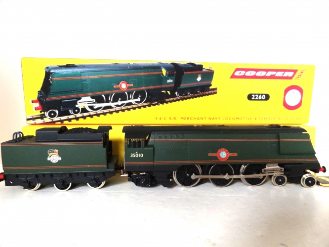This is a superb Cooper Trains Limited Edition of the British Rail in Green "Blue Star" , running number 35010 produced by Cooper Trains (Tony and Darren) in 2011 for 2 Rail running. The tender has the early BR totem. This is No 8 of a limited run of 15 and in my opinion equates to the standard achieved by Wrenn, Basildon in the later years (1991/2) before closure of the Basildon factory.